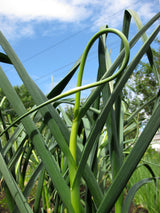 Garlic scapes, the flowering stalk of the garlic, are great chopped up to use in stir fry or processed into garlic scape pesto.