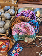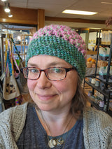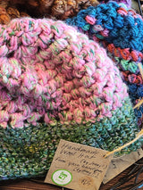 Handmade (by myself!) wool hats, colors vary. Each hat is one of a kind. I crocheted them from the hand-dyed (in Beloit!) yarn that we carry here in the store.