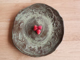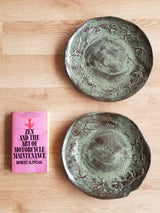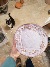 I hand built these stoneware ceramic plates (instead of throwing them on a potter's wheel) which creates it's natural shapes. I make my pottery this way because this is how I make my ceramic sculptures and because I wanted to make plates that felt like they had grown into being pottery instead of having been made into plates.