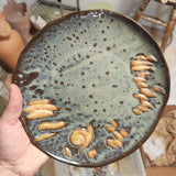 I hand built these stoneware ceramic plates (instead of throwing them on a potter's wheel) which creates it's natural shapes. I make my pottery this way because this is how I make my ceramic sculptures and because I wanted to make plates that felt like they had grown into being pottery instead of having been made into plates.