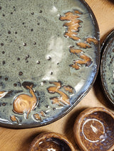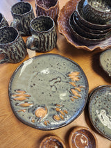 Invite the woodland into your dining room with my original hand carved dinner plates featuring fungi and an adventurous snail. Life is better when you transform your home into a natural refuge from hectic modern life: one lichen green pottery mug at a time.