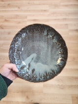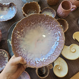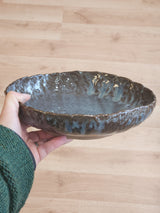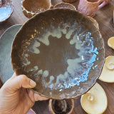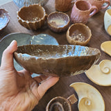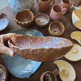 I hand build these stoneware ceramic bowls (instead of throwing them on a potter's wheel) which creates their natural shapes. I make my pottery this way because this is how I make my ceramic sculptures and because I wanted to make plates that felt like they had grown into being pottery instead of having been made into plates.