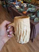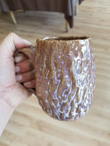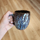I hand built this stoneware ceramic mug (instead of throwing it on a potter's wheel) which creates it's natural tree trunk texture. I make my pottery this way because this is how I make my ceramic sculptures and because I wanted to make mugs that felt like they had grown into being mugs instead of having been made into mugs.