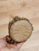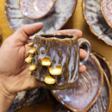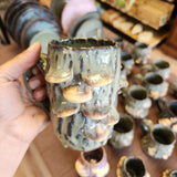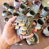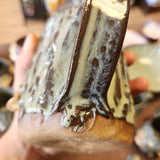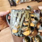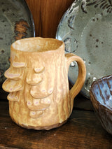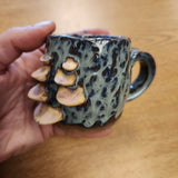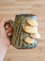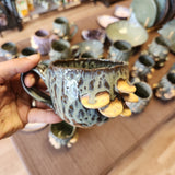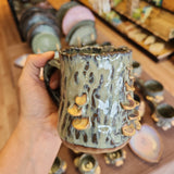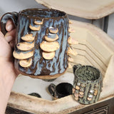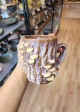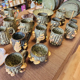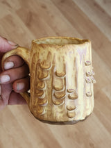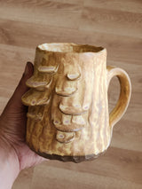 I hand built this stoneware ceramic mug (instead of throwing it on a potter's wheel) which creates it's natural tree trunk texture. I make my pottery this way because this is how I make my ceramic sculptures and because I wanted to make mugs that felt like they had grown into being mugs instead of having been made into mugs.