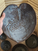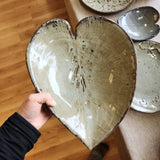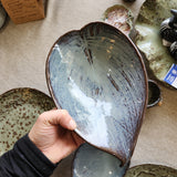 I hand built these stoneware ceramic plates (instead of throwing them on a potter's wheel) which creates it's natural shapes. I make my pottery this way because this is how I make my ceramic sculptures and because I wanted to make plates that felt like they had grown into being pottery instead of having been made into plates.