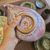 I call these "leaf dishes" because they aren't quite bowls and they're not quite plates. I make these by pressing real hosta leaves into wet clay and then forming the vessel with the leaf prints I make. Perfect for eating a handful of nuts or berries or to sit on your dresser as a catch-all for rings and change. Life is better when you transform your home into a natural refuge from hectic modern life: one friendly leaf dish at a time.