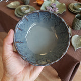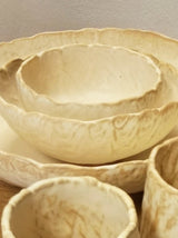 I hand build these stoneware ceramic bowls (instead of throwing them on a potter's wheel) which creates their natural shapes. I make my pottery this way because this is how I make my ceramic sculptures and because I wanted to make plates that felt like they had grown into being pottery instead of having been made into plates.